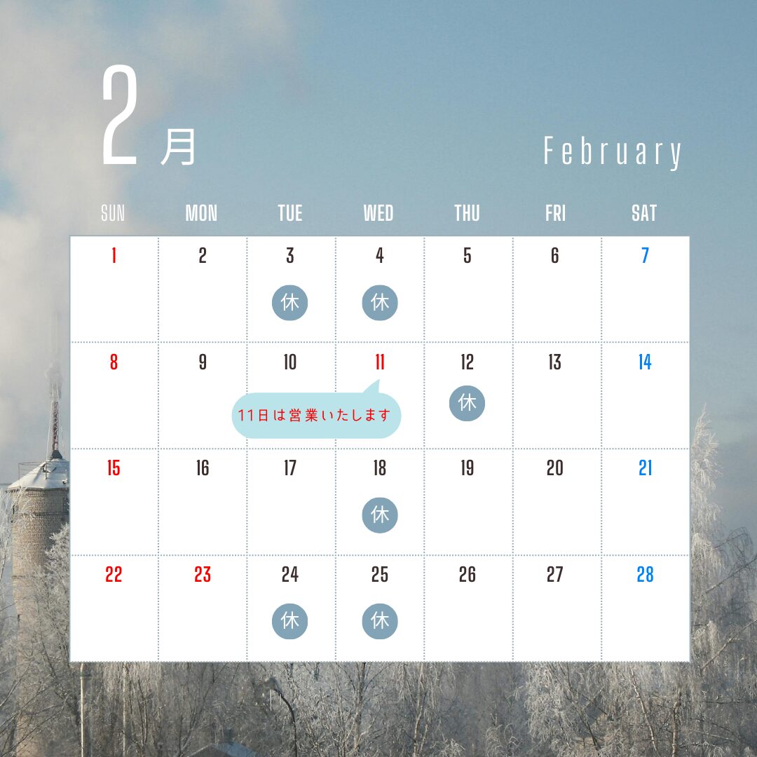2026.01.22 2月営業日のお知らせ いつもご来店ありがとうございます😊 連日の寒さと、雪かきですっかり身体が固まってしまっている今日この頃・・・皆様お元気でお過ごしでしょうか2月の営業日のお知らせです(*^^*)本来水曜日は定休日となりますが2月11日(祝水)は営業いたします!(^^)!ご予約お待ちしております♪