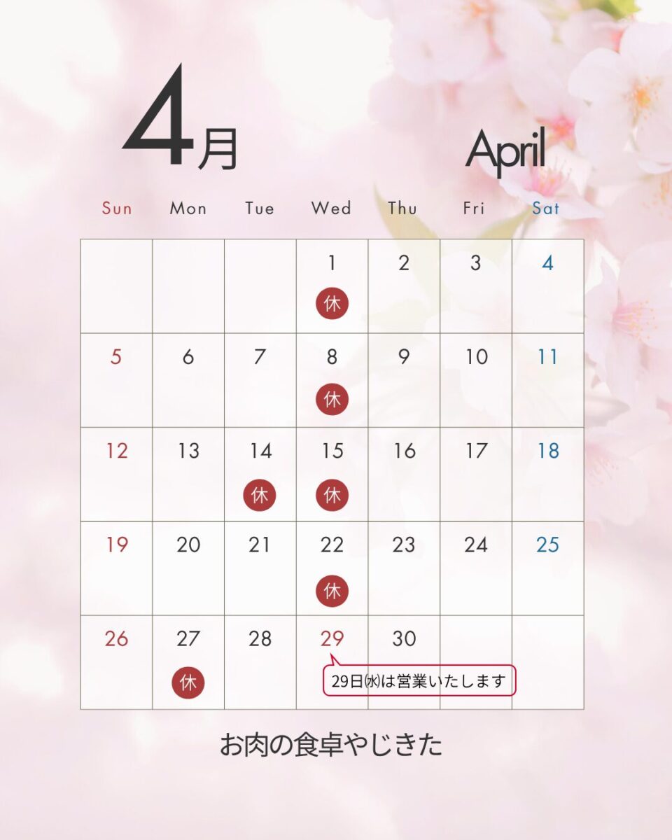 2026.03.24 4月営業日のお知らせ いつもご来店ありがとうございます😊春の陽気に誘われて、外出も楽しい時期となりましたね♪花粉症に悩まされる今日この頃。。皆様お変わりなくお過ごしでしょうか4月営業日のお知らせです!(^^)!今月は、27日㈪お休み、29日㈬営業日となっております。 新年度が始まり、何かとご多忙とは思いますが新しい出会いと希望に満ちた4月。皆様のご発展を心より願っております!(^^)!歓迎会のご予約もまだまだ承っております♪新年度のスタートは是非当店で\(^o^)/ご予約お待ちしております😊